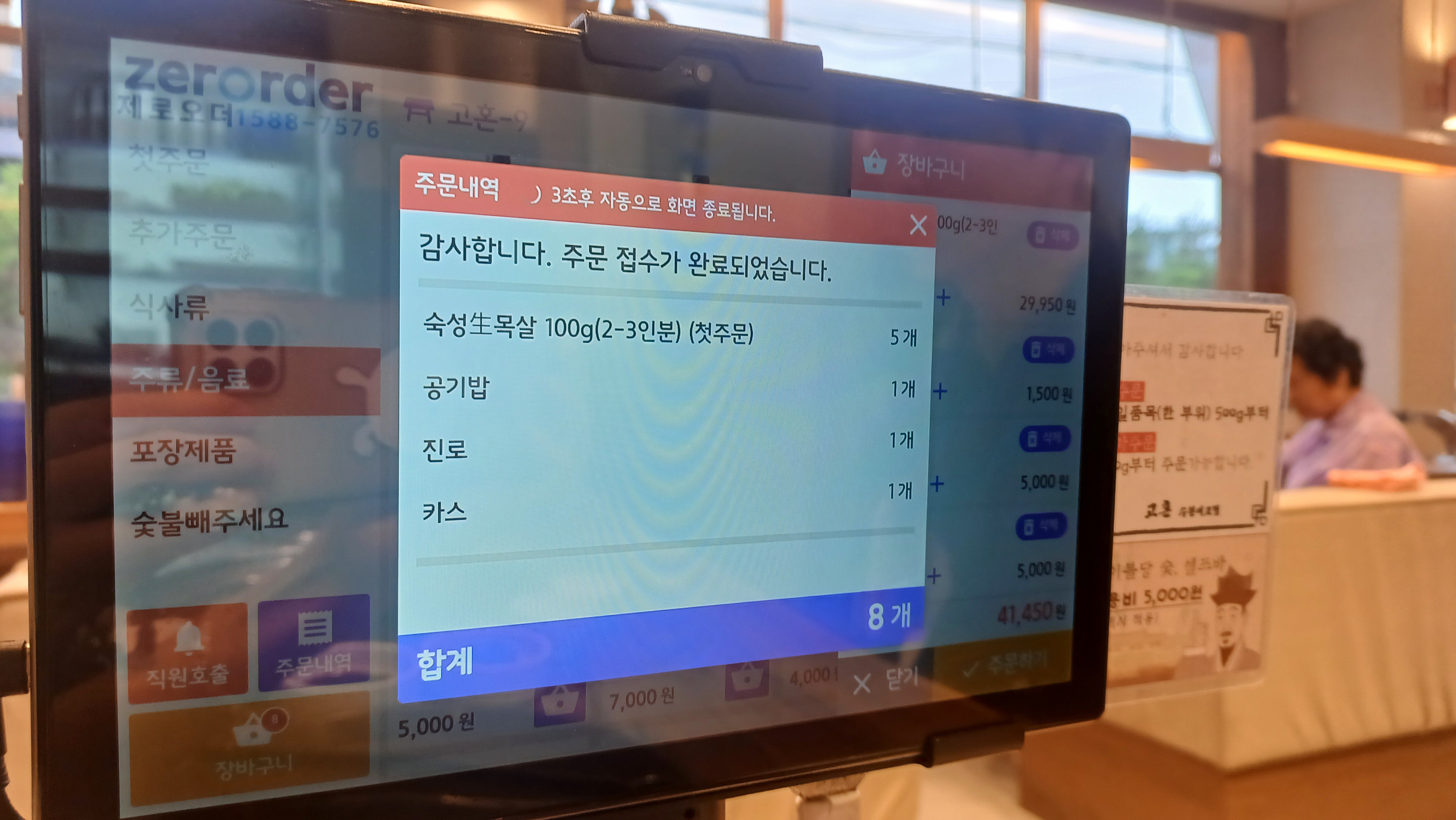 저는 태블릿을 통해 직접 주문을 진행했어요. "장바구니" 화면은 직관적이고 사용하기 쉬웠습니다. 제가 주문한 내역은 다음과 같아요: