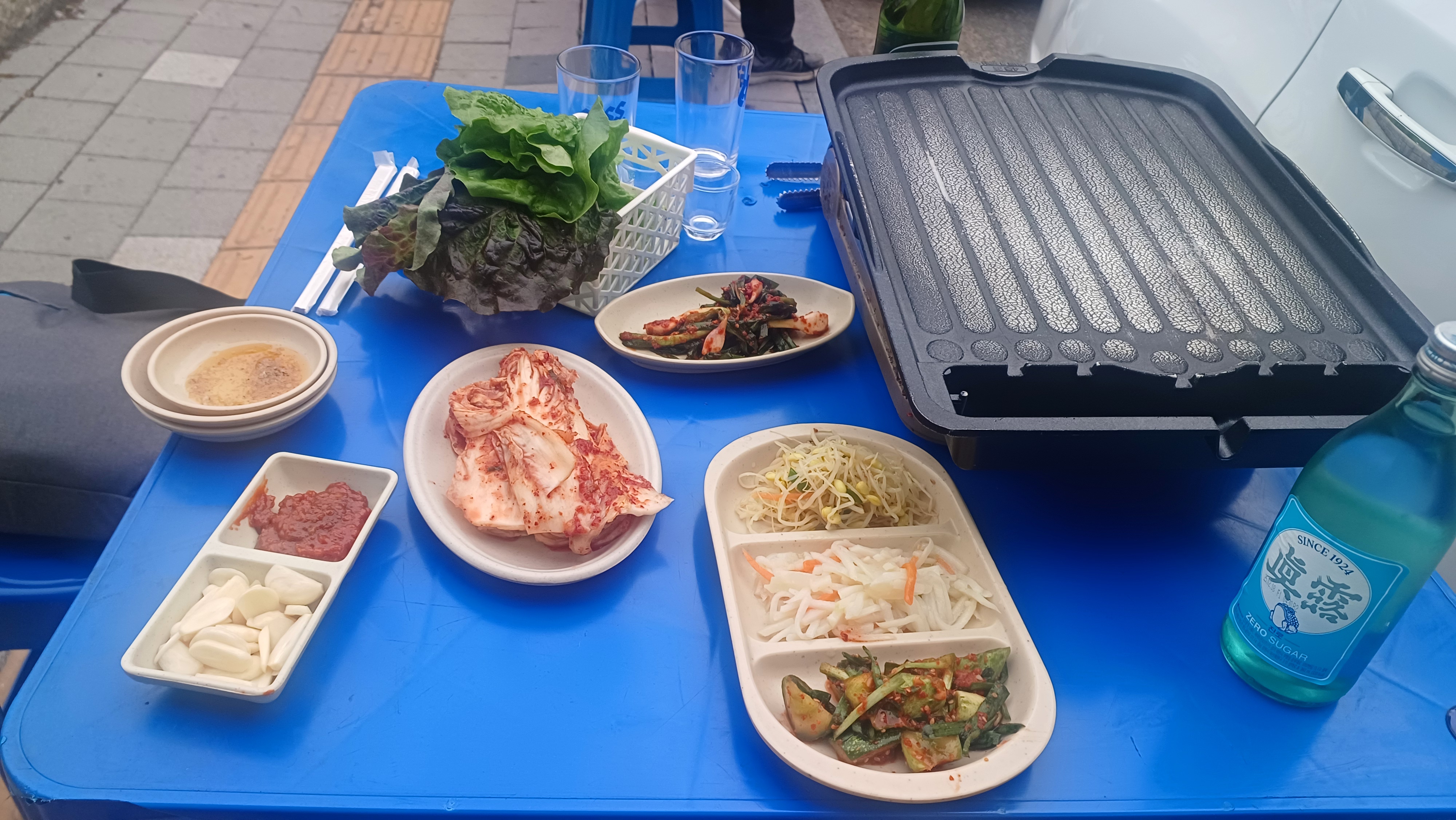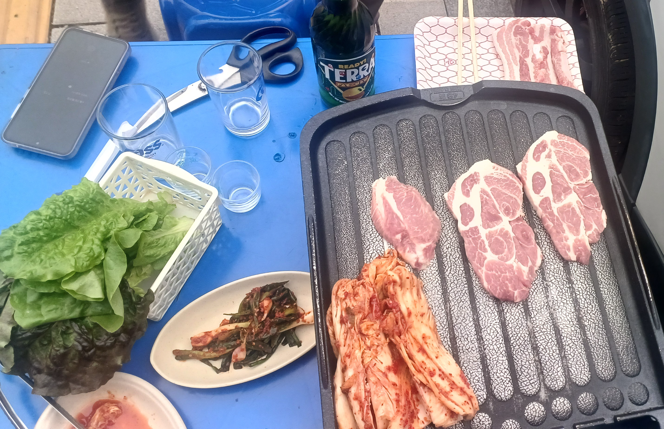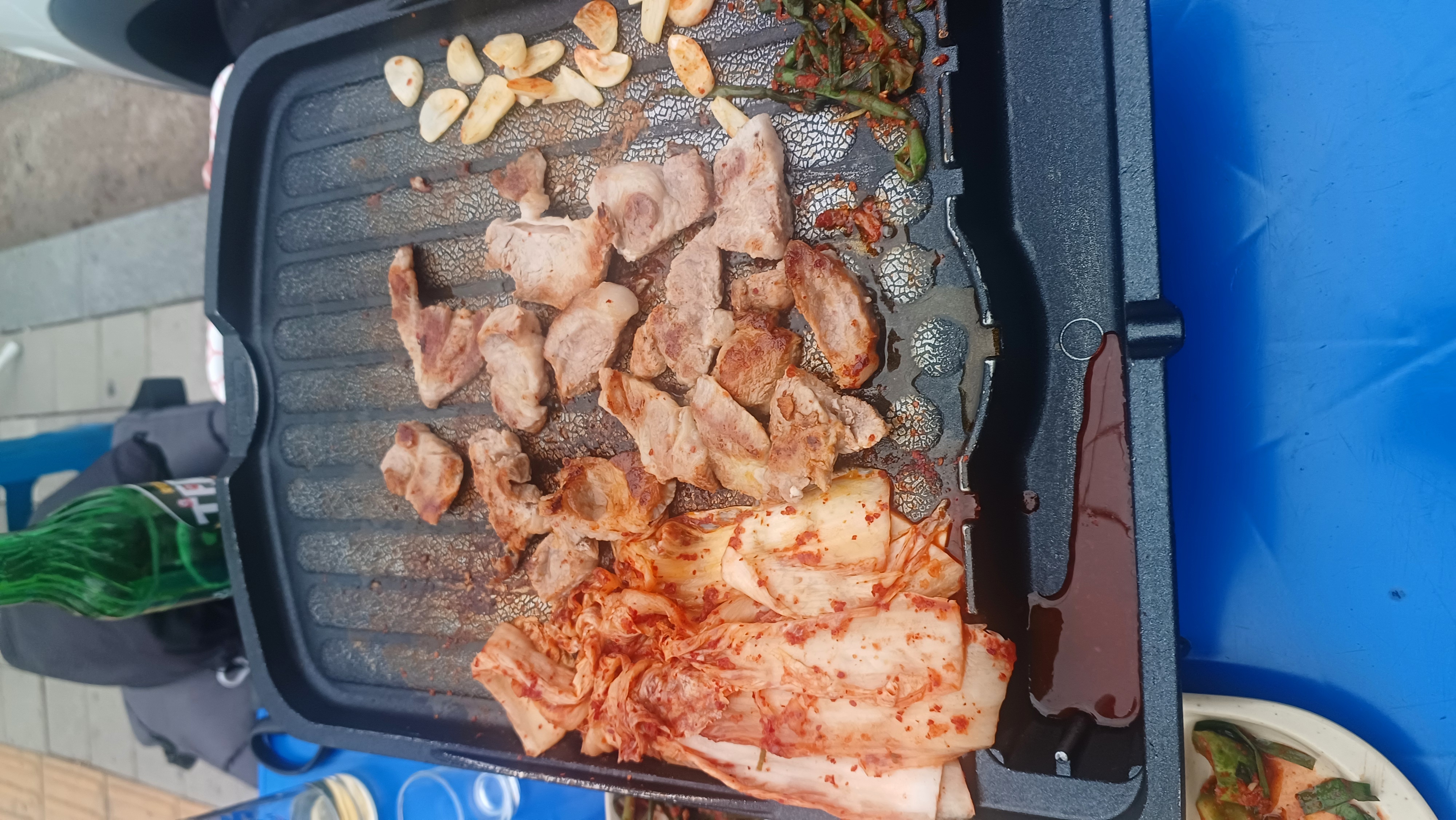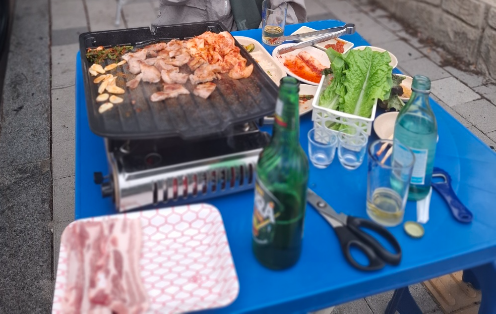 야외 테이블에 앉아 주문한 고기를 가스버너에 구워 먹는데, 시원한 바람을 맞으며 고기를 굽는 재미가 정말 쏠쏠했어요. 숯불이 아닌 가스버너였지만, 화력이 좋아서 고기가 노릇노릇 맛있게 잘 구워졌습니다. 잡내 없이 고소하고 육즙 가득한 맛이 입안 가득 퍼지는데, 정말 환상적이었습니다!