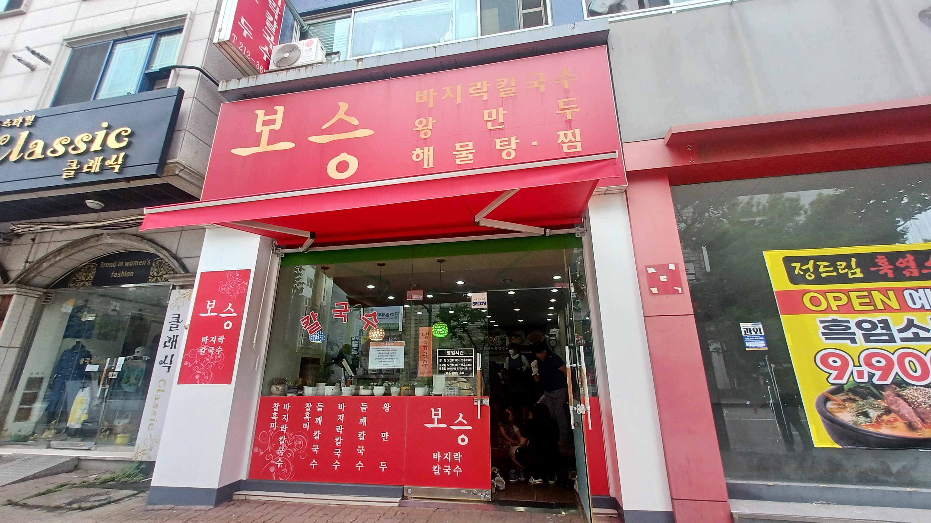 깔끔하고 친절한 보승칼국수 매장 외부 모습도 함께 보여드릴게요. '보승칼국수'라는 큼지막한 간판이 눈에 띄고, 깔끔한 외관을 자랑합니다.