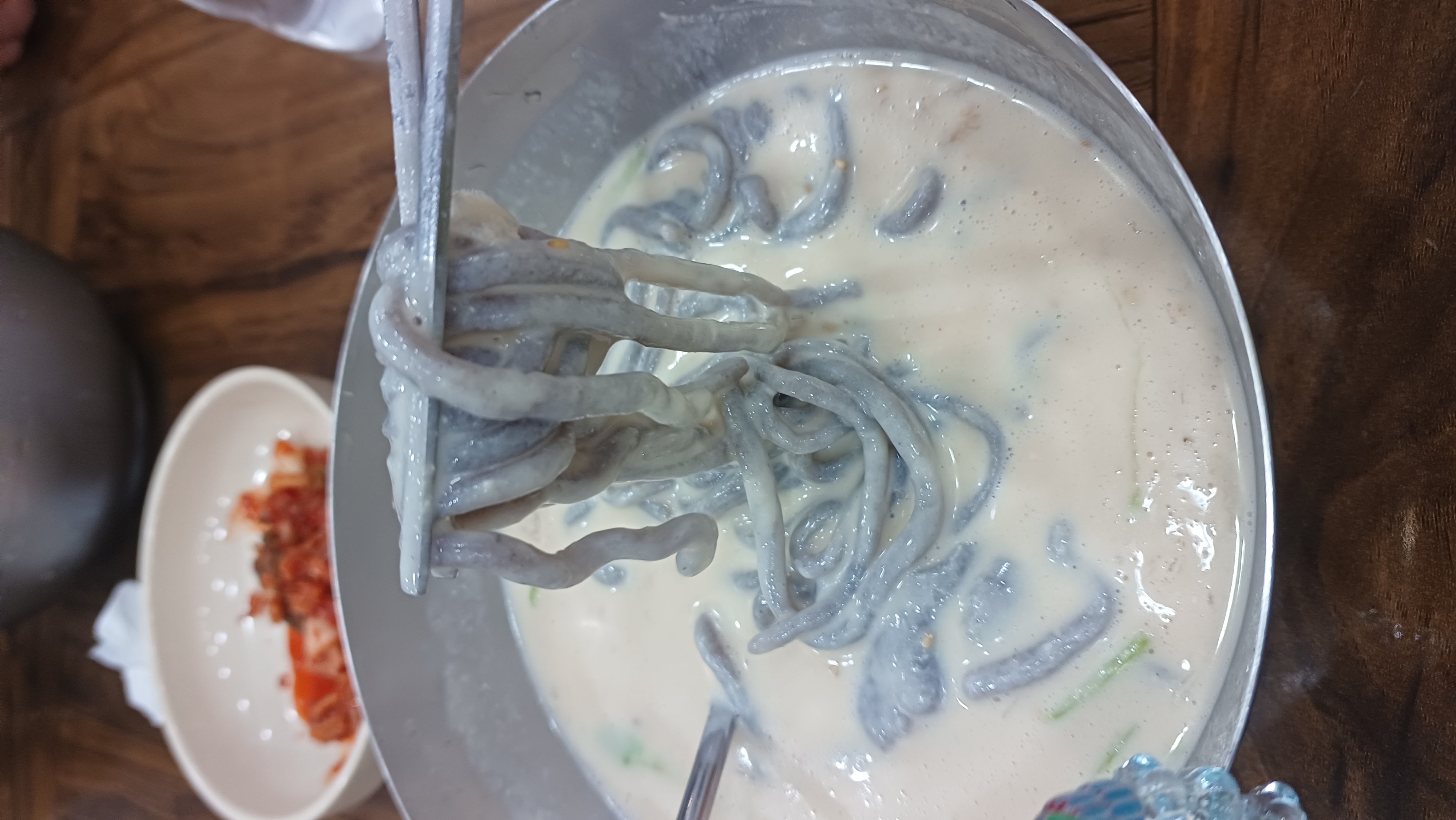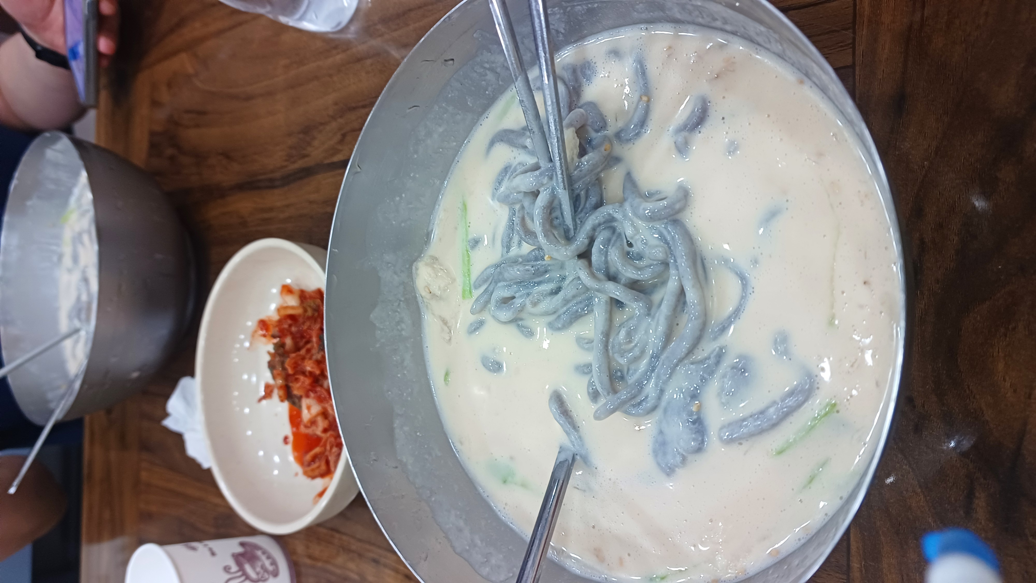 쫄깃한 찰흑미면과 진한 국물의 환상 조합! 찰흑미면 콩국수 사진에서 보시는 것처럼, 제가 주문한 메뉴는 바로 '찰흑미면 콩국수'입니다. 보승칼국수에서는 일반 칼국수 면 외에도 이렇게 찰흑미로 만든 특별한 면을 맛볼 수 있는데요. 쫄깃하면서도 부드러운 찰흑미면발에 진하고 고소한 콩국물이 어우러져 정말 별미였습니다.