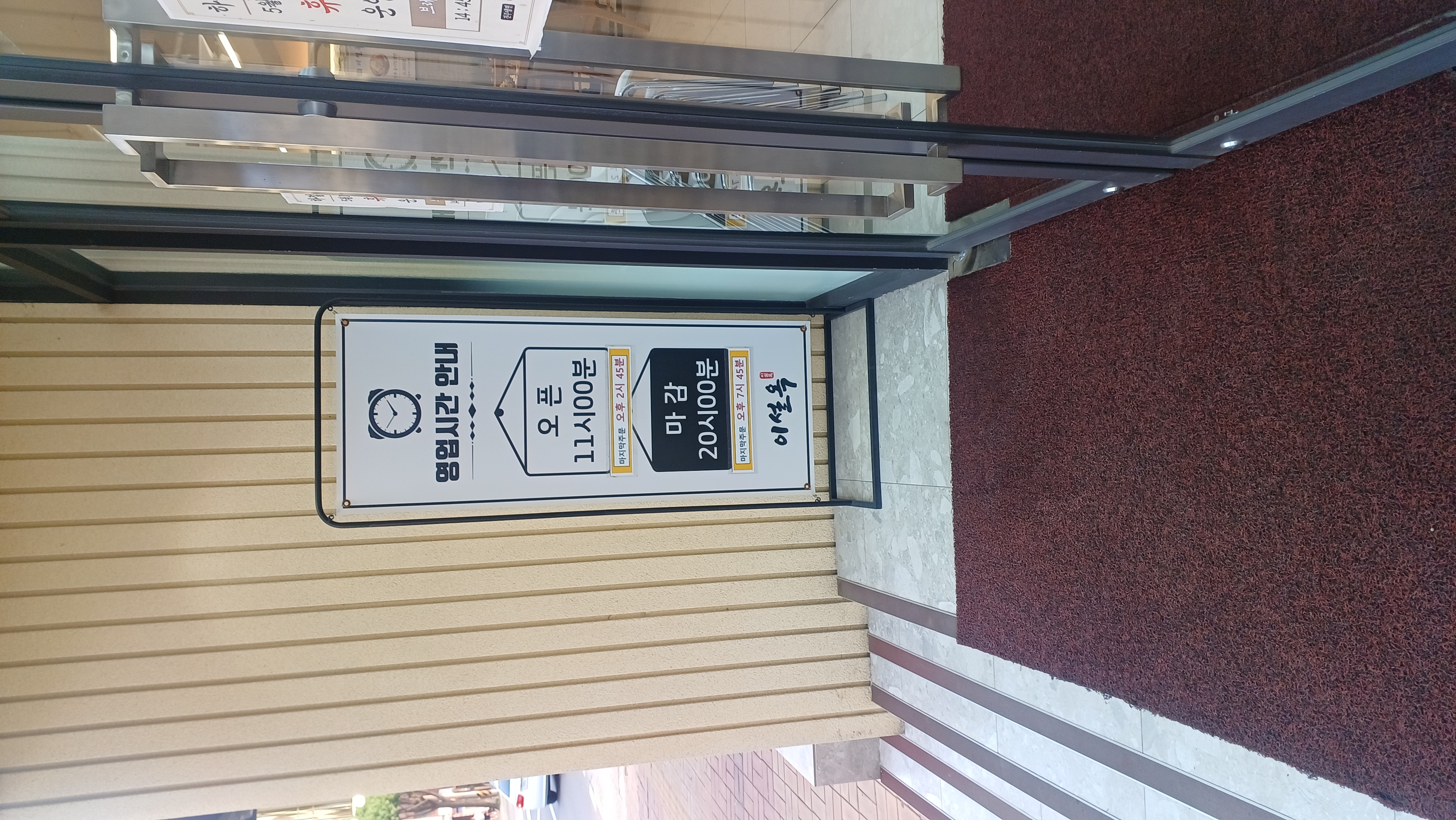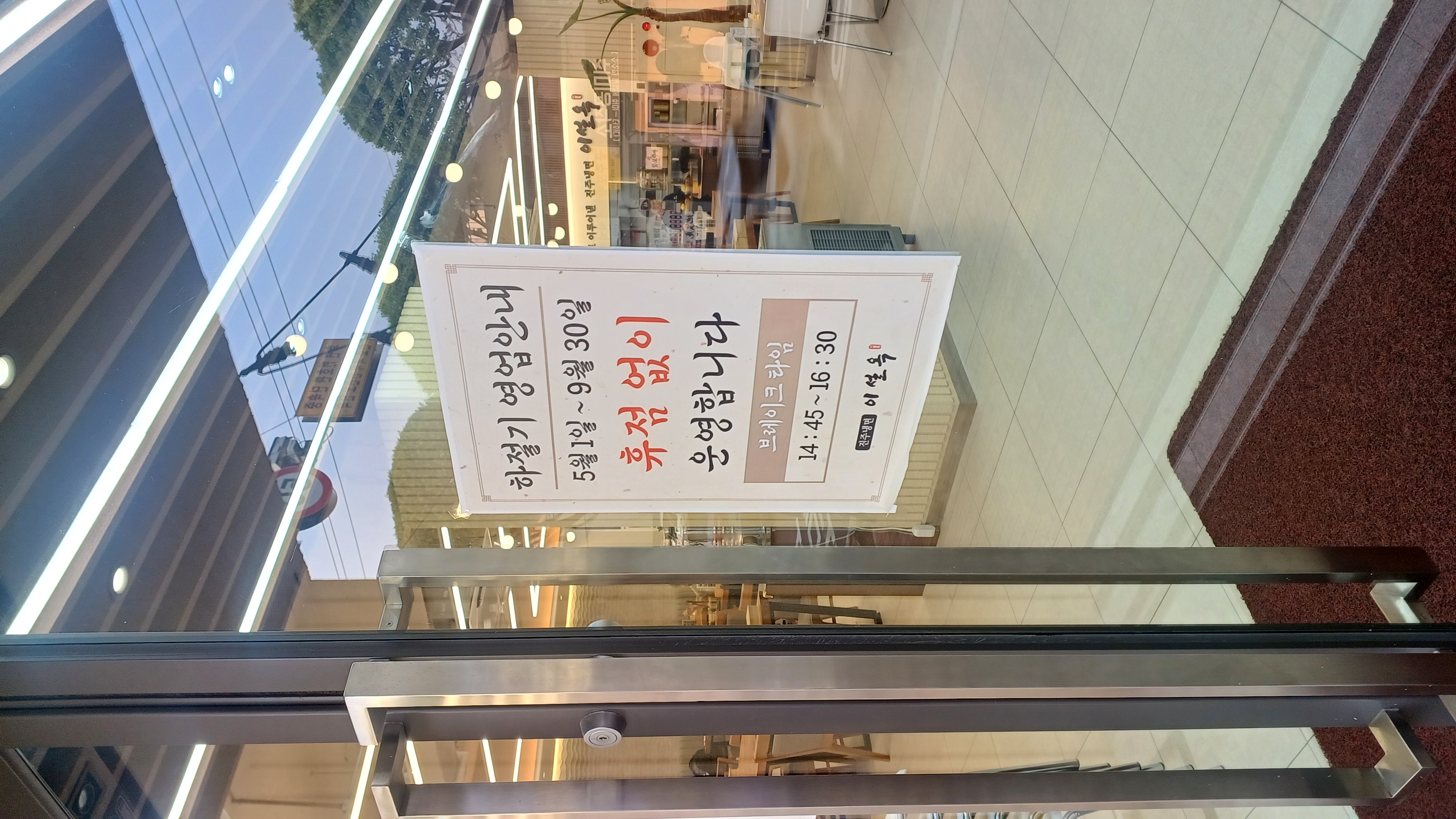 📢 방문 전 꼭 확인하세요! 이설옥 진주냉면 영업시간 안내 📢 방문 계획이 있으신 분들을 위해 입구에 부착된 영업시간 안내를 찍어왔어요. 운영 시간: * 오픈: 오전 11시 00분 (마지막 주문: 오후 7시 45분) * 마감: 오후 8시 00분