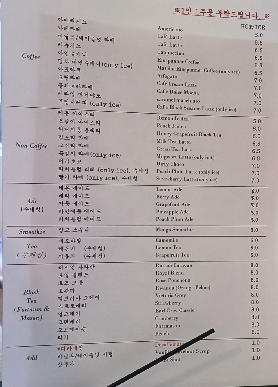 - 아메리카노 (HOT): 깔끔하고 깊은 맛으로 어떤 디저트와도 잘 어울려요.