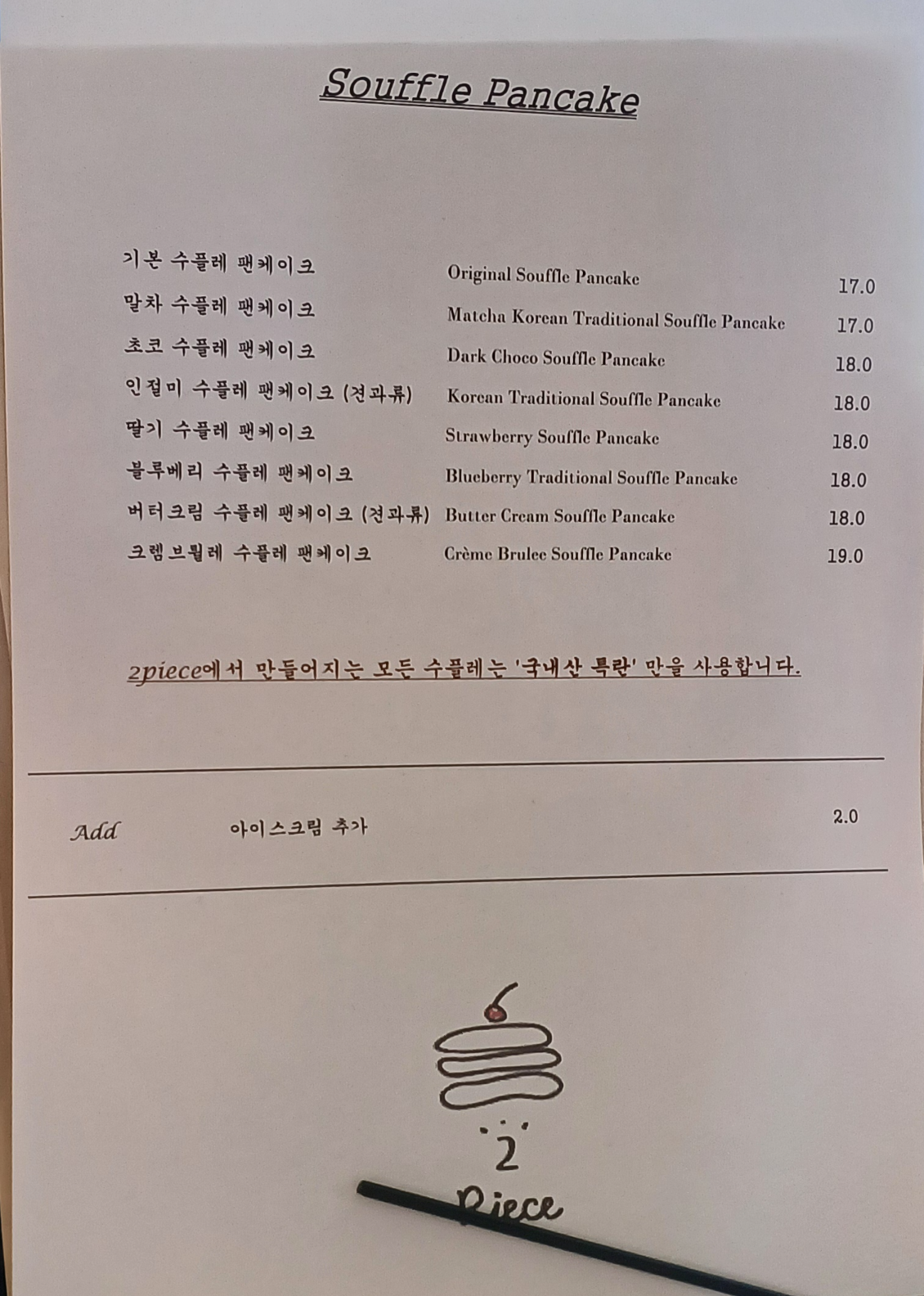 🥞 부드러움의 극치, 수플레 팬케이크 이곳의 시그니처 메뉴는 역시 수플레 팬케이크입니다! 오리지널부터 말차, 다크 초코, 딸기, 블루베리, 버터 크림, 크렘 브륄레 등 다양한 종류가 준비되어 있어 고르는 재미가 쏠쏠해요. 2piece의 모든 수플레 팬케이크는 '국내산 통밀'을 사용한다고 하니 더욱 믿고 먹을 수 있겠죠?